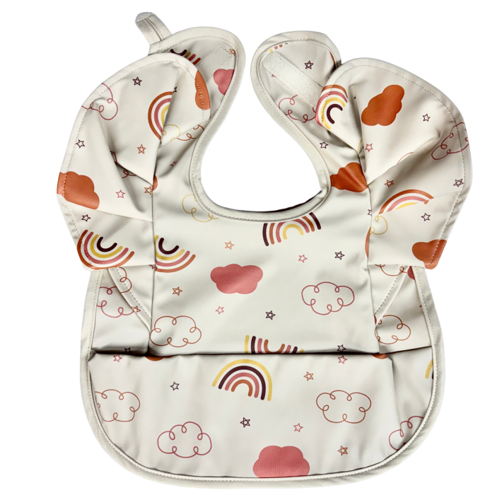 Διακοσμημένη με σύννεφα και ουράνιο τόξο σε απαλές αποχρώσεις, αυτή η σαλιάρα συνδυάζει πρακτικότητα και αισθητική — ιδανική τόσο για το σπίτι όσο και για δώρο.