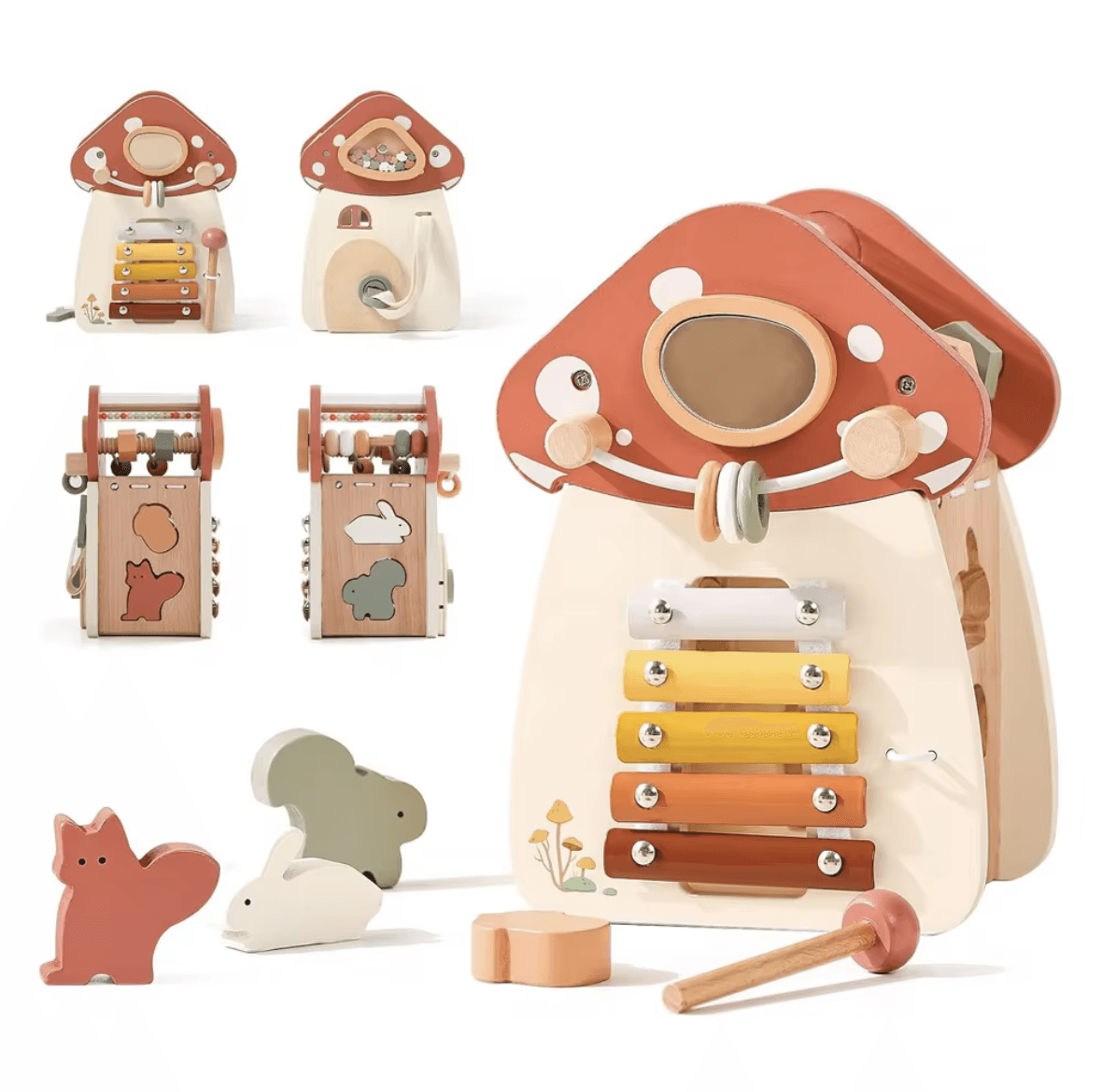 Ένα παιχνιδιάρικο ξύλινο μανιτάρι γεμάτο εκπλήξεις! Το πολυλειτουργικό αυτό παιχνίδι προσφέρει στις πρώτες εξερευνήσεις του μωρού σας ποικιλία ερεθισμάτων μέσα από διαφορετικές δραστηριότητες: